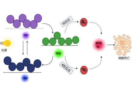 注:1PS0!基态光敏;1PS*:激发单沉态光敏剂;3PS*:激发三沉态光敏剂;1O2:单线 光动力杀菌机理。